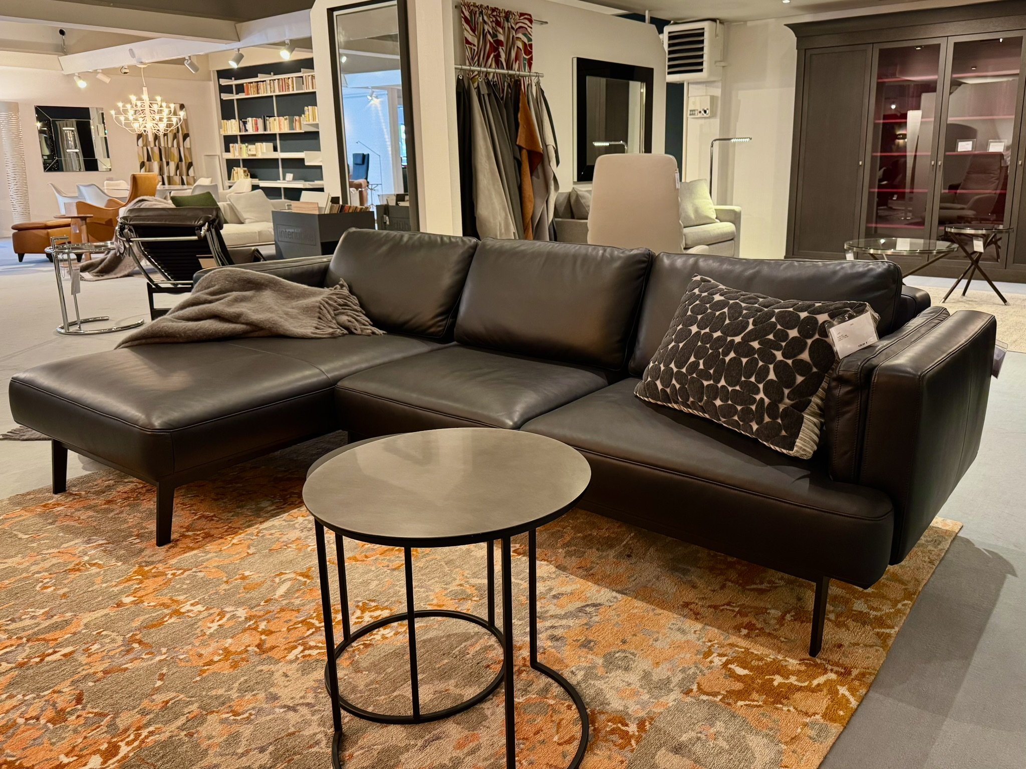 Sofa mit Sitztiefenverstellung und abklappbaren Armlehnen, Leder: schwarz